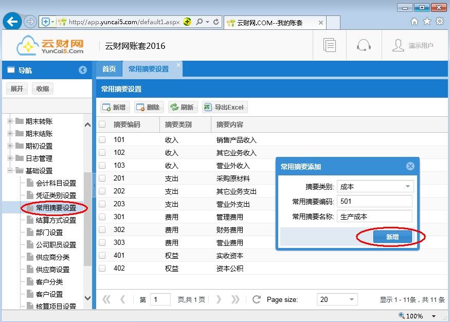 【基础设置--常用摘要设置】→ 输入分类,然后设置编码和摘要名称,点击【新增】即可保存,同时编码递增,准备增加下一条。